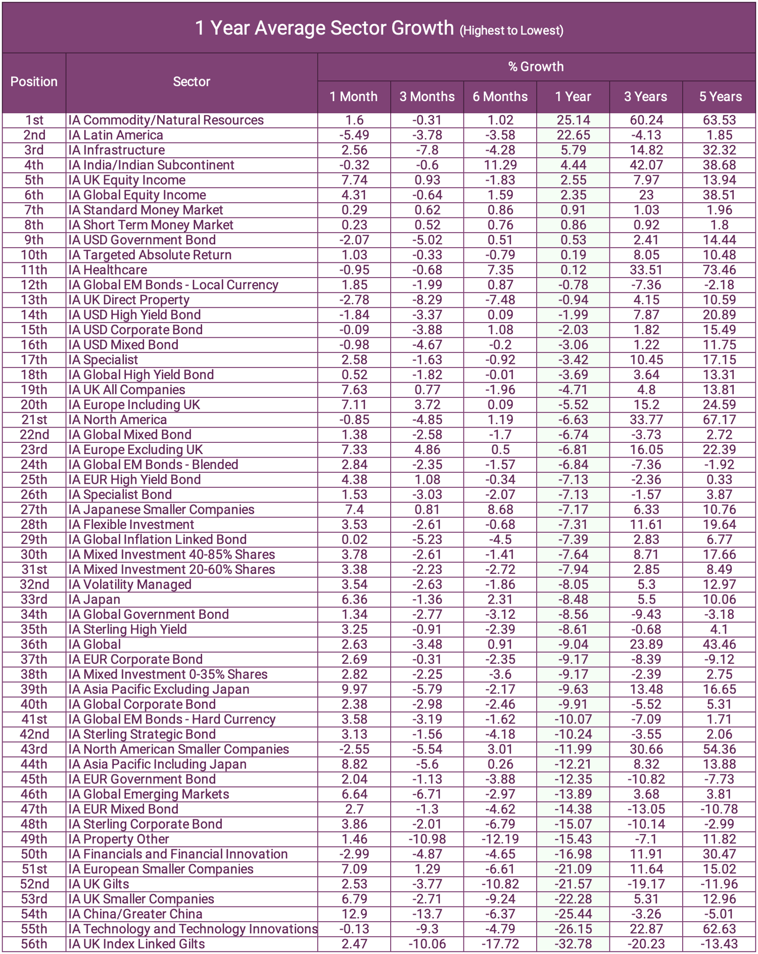- Of the 56 sectors analysed, the IA Commodity and Natural Resources sector averaged the highest returns with growth of 25.14%.