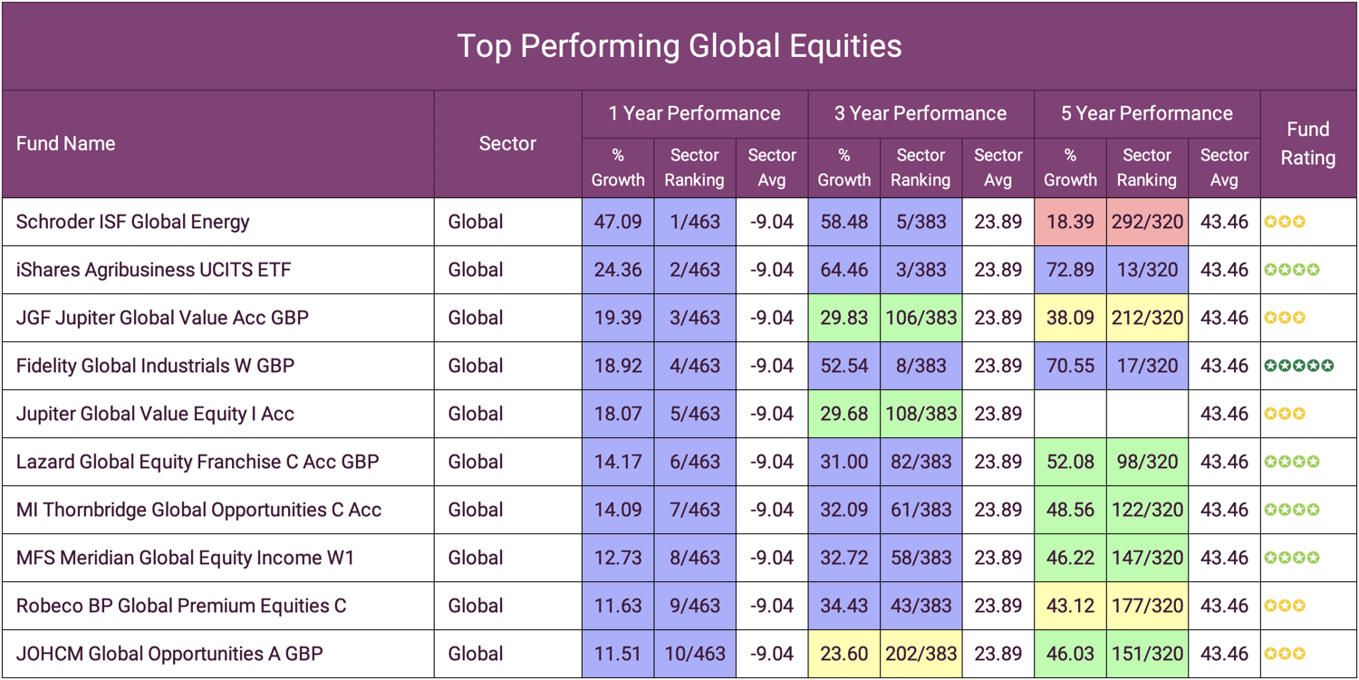 The funds featured in the table above represent the 10 funds with the highest growth returns from an analysis of 3,883 funds over the past 12 months. As the table shows, 7 of the top 10 funds are classified within the Commodities & Natural Resources, which is unsurprising considering the huge hikes in energy prices since the outbreak of war in Ukraine. As the funds within this sector are heavily invested in energy companies they are among the few sectors to have average growth this year.