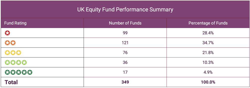 - In our analysis of the 349 funds in the UK equity market, 53 managed to receive a top performing 4 or 5 star rating.
