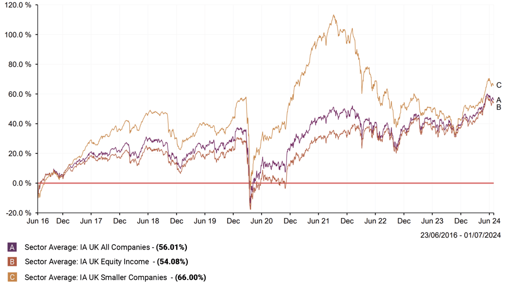 Average Performance of each UK Equity fund sector since the Brexit referendum