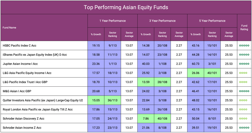 The 10 funds below have been selected from the best performing Asian Equity funds that have received a 4 or 5 star rating for their 1, 3 & 5 year performance and sector ranking.